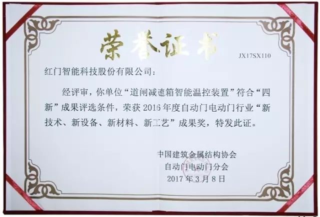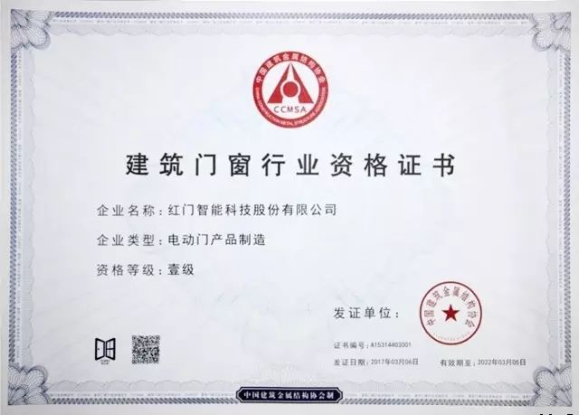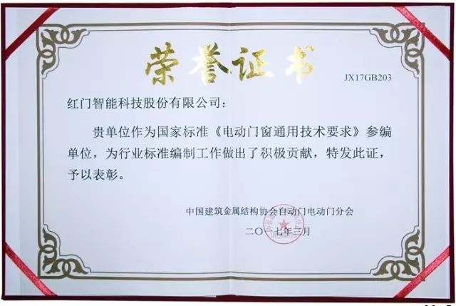 一級資質(zhì)是自動門電動門行業(yè)資質(zhì)標(biāo)準(zhǔn)的***別,是衡量企業(yè)整體實力的重要指標(biāo),本次大會全國僅有三家企業(yè)獲得一級資質(zhì),紅門便是其中之一。成功獲得電動門行業(yè)制造一級資質(zhì)證書,足見紅門在人員素質(zhì)、制造能力、管理質(zhì)量、工程業(yè)績等各方面的強(qiáng)大實力。除此之外,紅門自主創(chuàng)新的“道閘減速箱智能溫控裝置”技術(shù)拿下2016年度自動門電動門行業(yè)“新技術(shù)、新設(shè)備、新材料、新工藝”成果獎。作為國家標(biāo)準(zhǔn)《電動門窗通用技術(shù)要求》參編單位,紅門還積極參與協(xié)會組織的各項活動,在編寫過程中表現(xiàn)出色,獲得榮譽證書。
